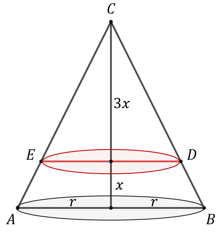 Płaszczyzna dzieli wysokość stożka w stosunku \(1:3\), zatem możemy podpisać jego wysokość za pomocą odcinków długości \(x\) oraz \(3x\):