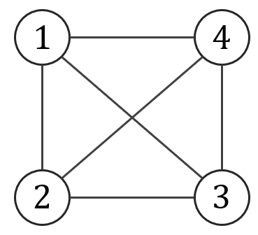 Macierz sąsiedztwa: \[ A(K_4)= \begin{pmatrix} 0&1&1&1\\ 1&0&1&1\\ 1&1&0&1\\ 1&1&1&0 \end{pmatrix} \] Dopełnieniem grafu \(K_4\) jest graf pusty \({\overline {K_4}}\):