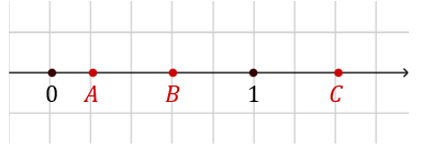 Kratki dzielą oś liczbową w taki sposób, że jedna kratka, to \(\frac{1}{9}\), zatem: \[\begin{split}&A=\frac{2}{9}\\[16pt] &B=\frac{6}{9}=\frac{2}{3}\\[16pt] &C=\frac{8}{9}\end{split}\]
